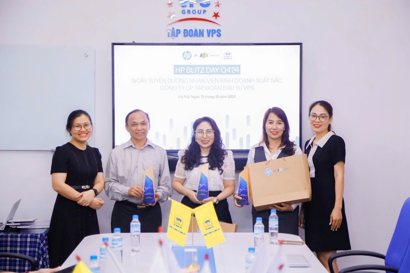 Chị Phan Thị Thắm đứng thứ hai từ phải sang nhận kỷ niệm chương cán bộ bán hàng xuất sắc nhất do Đại diện FPT Synnex và HP Việt Nam trao tặng.